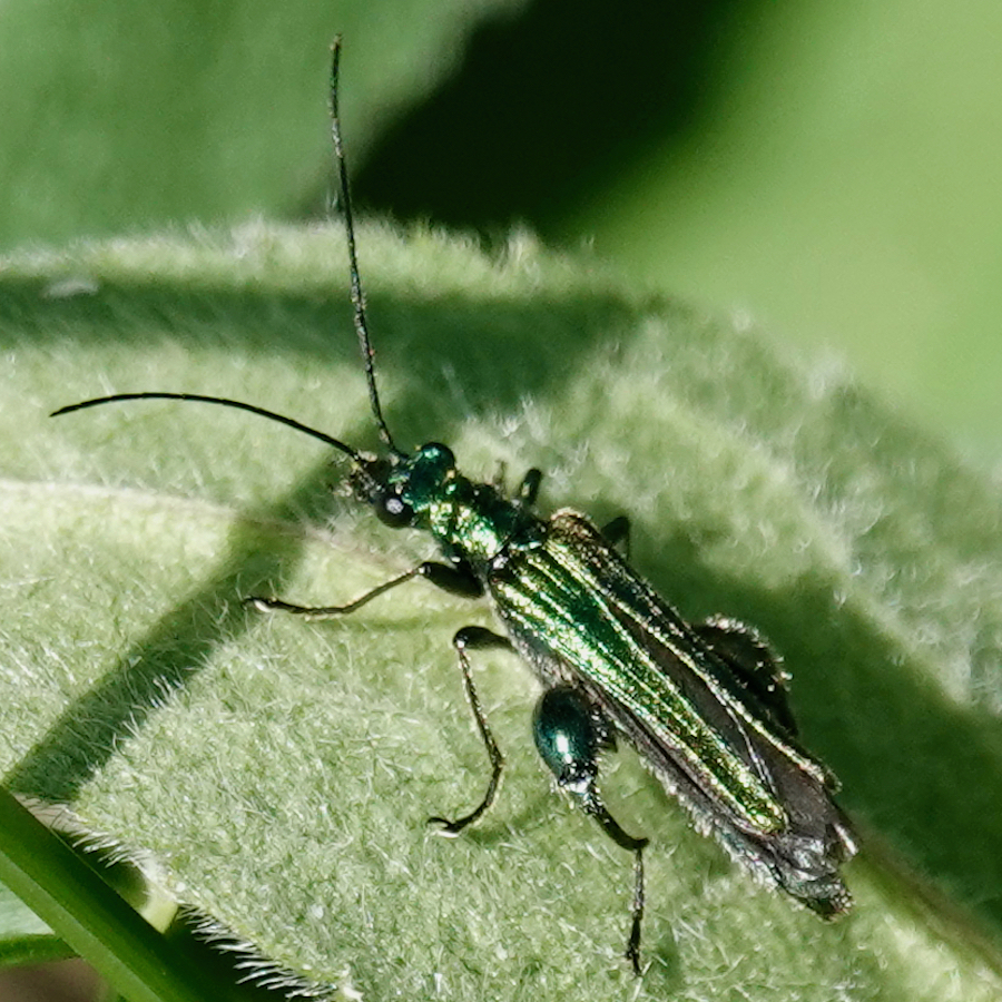 The Swollen-thighed Beetle is another species that is commonly seen around this time of year and I noticed the first of these in my garden recently. The males of the species have huge bulges on their hind legs. They are easy to recognise as they are bright metallic green in colour with a coppery sheen; another key feature is that their wing cases to not quite meet in the middle so the membranous wings can be seen. They are small beetles (6-12 mm) that feed on pollen of a wide range of plants, including brambles and daisies, so they are excellent pollinators. Their larvae live inside the stems of thistles so they are rarely seen. They used to be found only in the southern counties of England, but they are now widespread throughout the country.